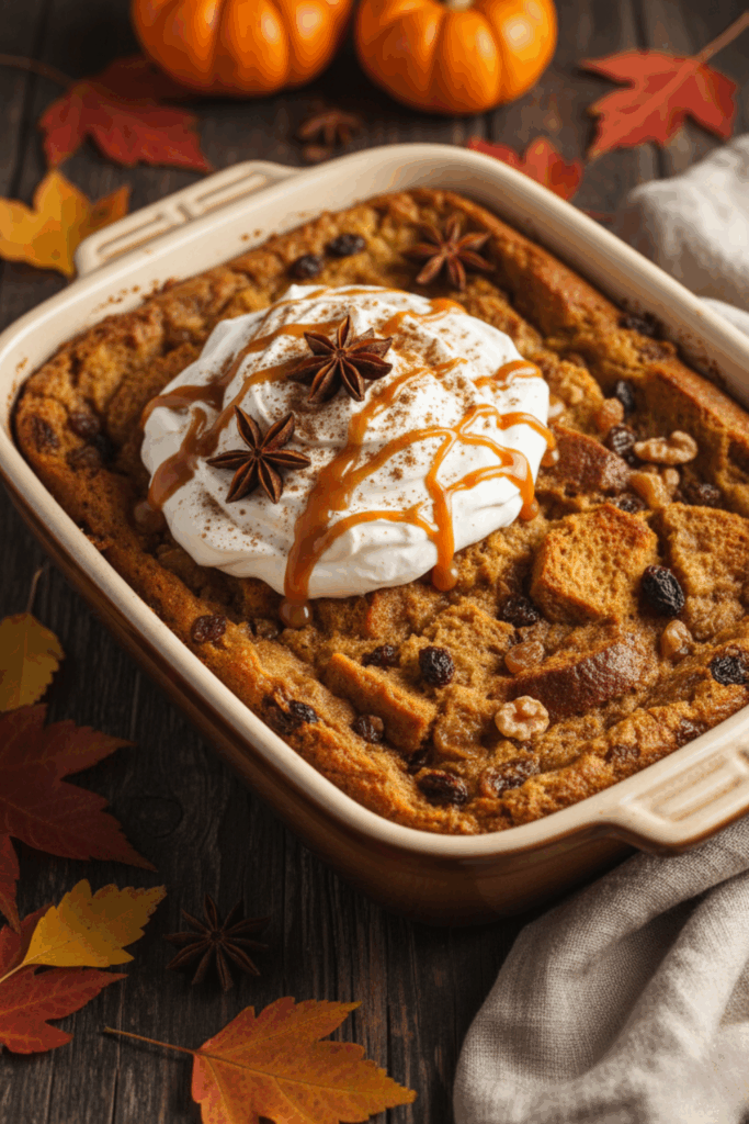 Whisk pumpkin puree into your custard base for an autumn-themed dessert. Add raisins, walnuts, and serve warm with whipped cream.