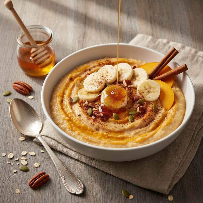A cozy bowl of oatmeal infused with pumpkin spice and mashed banana makes for a nutritious, low-sugar breakfast.