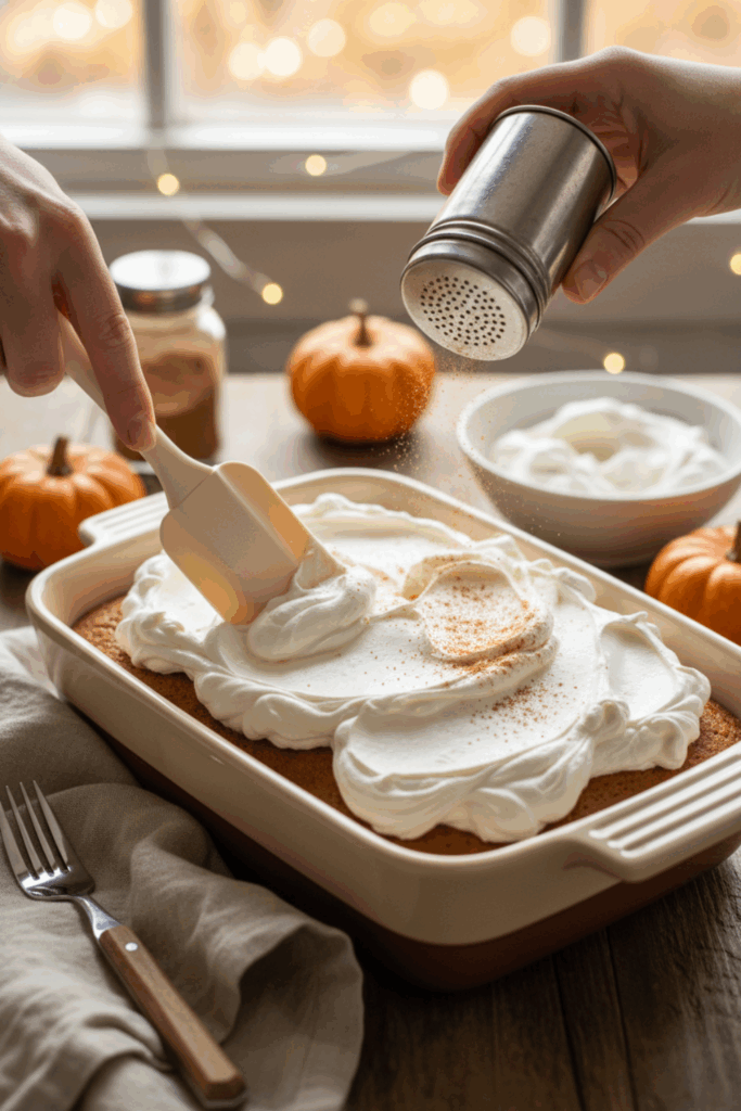 Cover and refrigerate for at least 2 hours, or overnight for best results. Before serving, spread whipped topping evenly over the chilled cake. Sprinkle with cinnamon, pumpkin pie spice, or your choice of toppings.