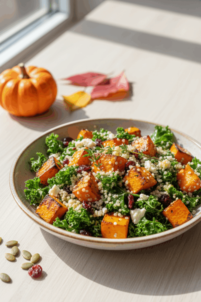 This light and nutritious salad features roasted pumpkin cubes, arugula, goat cheese, and a tangy vinaigrette.
