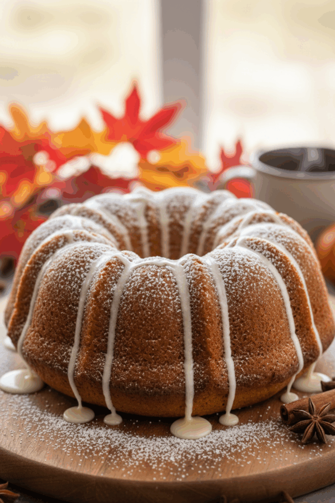 Pour the mixture into a greased Bundt pan, bake for 40–45 minutes, and top with a spiced glaze or powdered sugar.