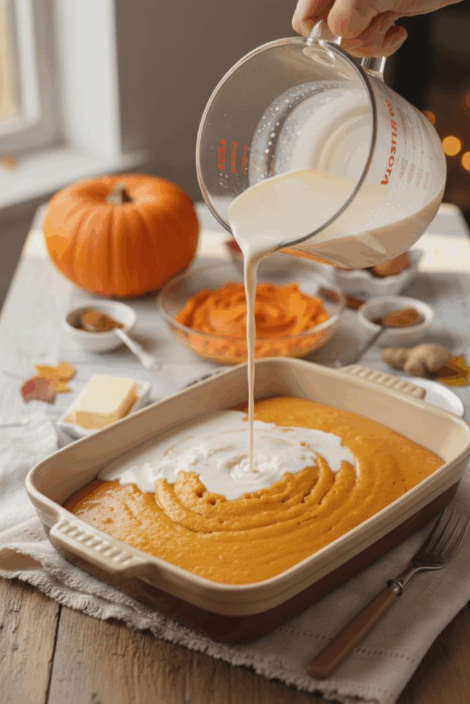 In a bowl, whisk together the evaporated milk, sweetened condensed milk, heavy cream, and cinnamon. Slowly pour the mixture evenly over the cake, allowing it to soak in.
