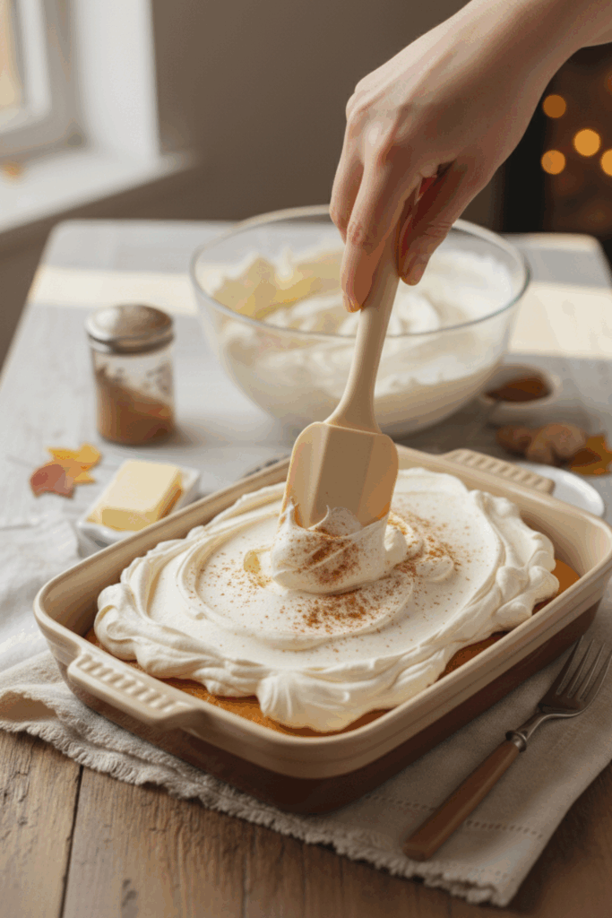 Just before serving, beat the heavy whipping cream, powdered sugar, and vanilla extract until soft peaks form. Spread over the chilled cake and dust with cinnamon.