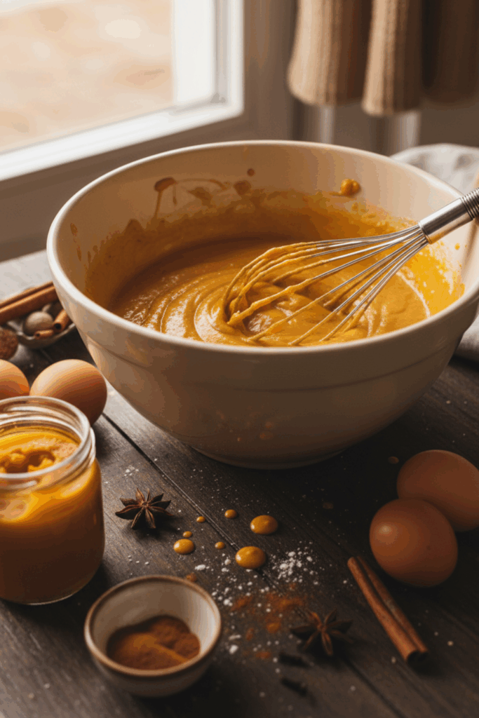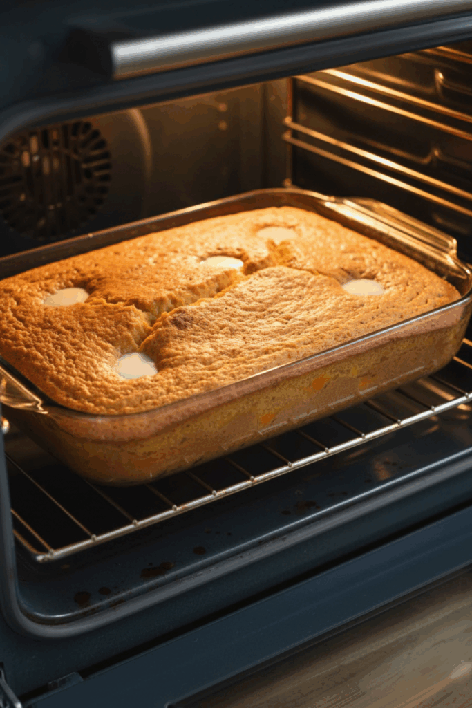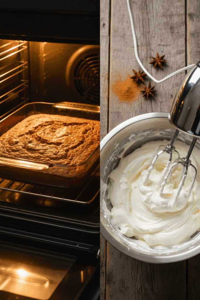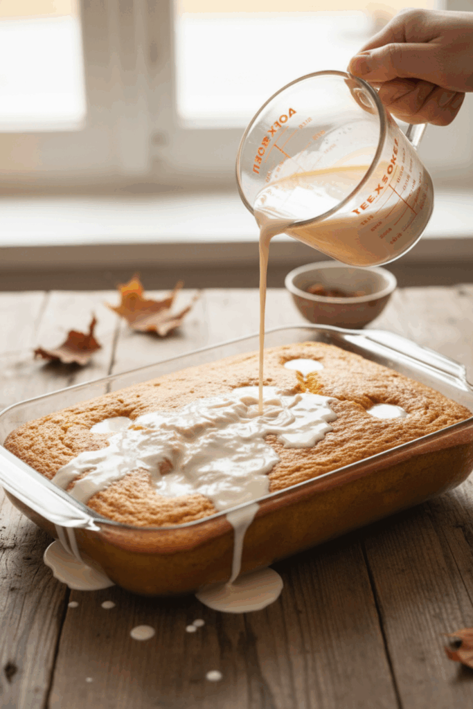 Preheat your oven to 350°F (175°C). Grease and flour a 9×13-inch baking dish. In one bowl, whisk together your dry ingredients: flour, baking powder, salt, and spices. In another, combine pumpkin puree, sugars, eggs, vanilla, oil, and milk. Mix wet and dry ingredients until just combined — don’t overmix or you’ll lose that soft sponge texture.