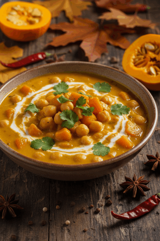 Inspired by Indian flavors, this hearty curry pairs sweet pumpkin with protein-rich chickpeas, garlic, cumin, and turmeric. Serve over basmati rice or with naan for a satisfying dinner.