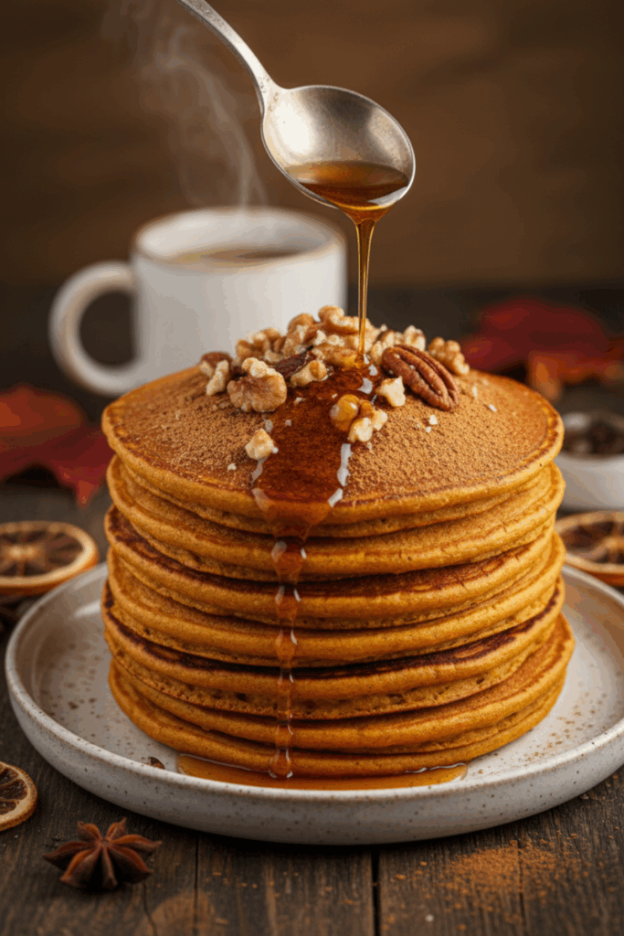 Fluffy and spiced with cinnamon, nutmeg, and cloves, these pancakes are a Fall brunch staple. Use flax eggs and almond milk to keep them fully plant-based.