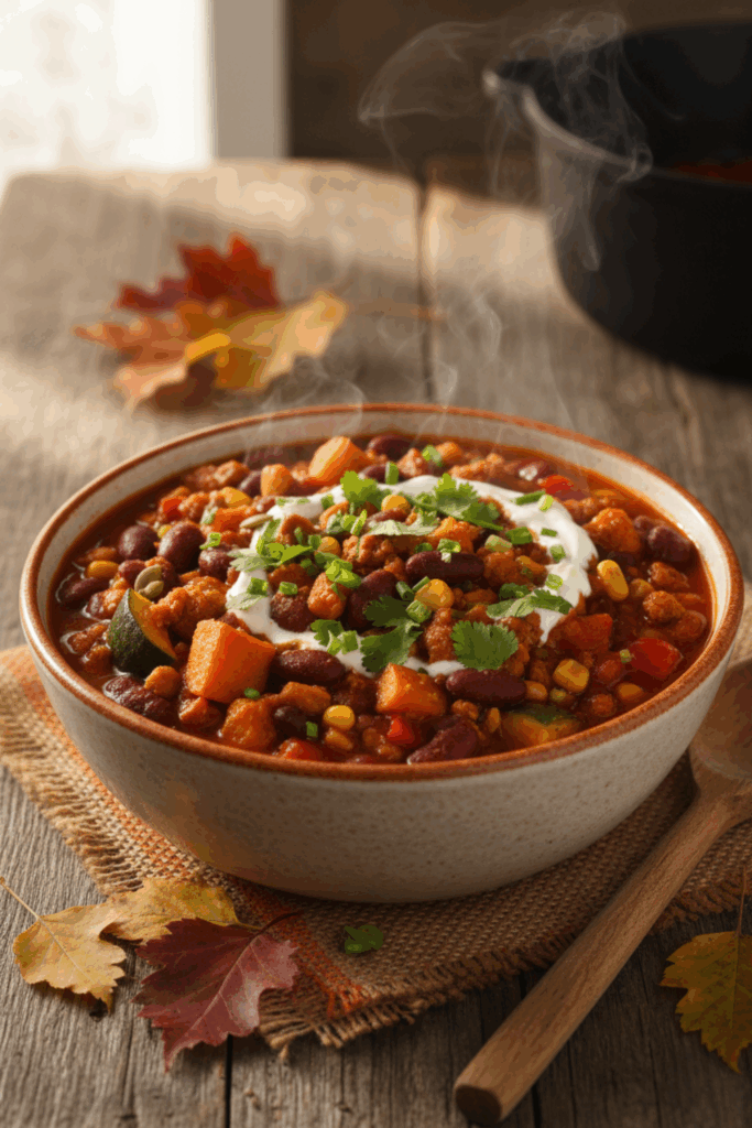 This unique spin on chili includes pumpkin puree to give it extra body and sweet undertones. Beans, tomatoes, corn, and plenty of spices make it protein-rich and soul-warming.